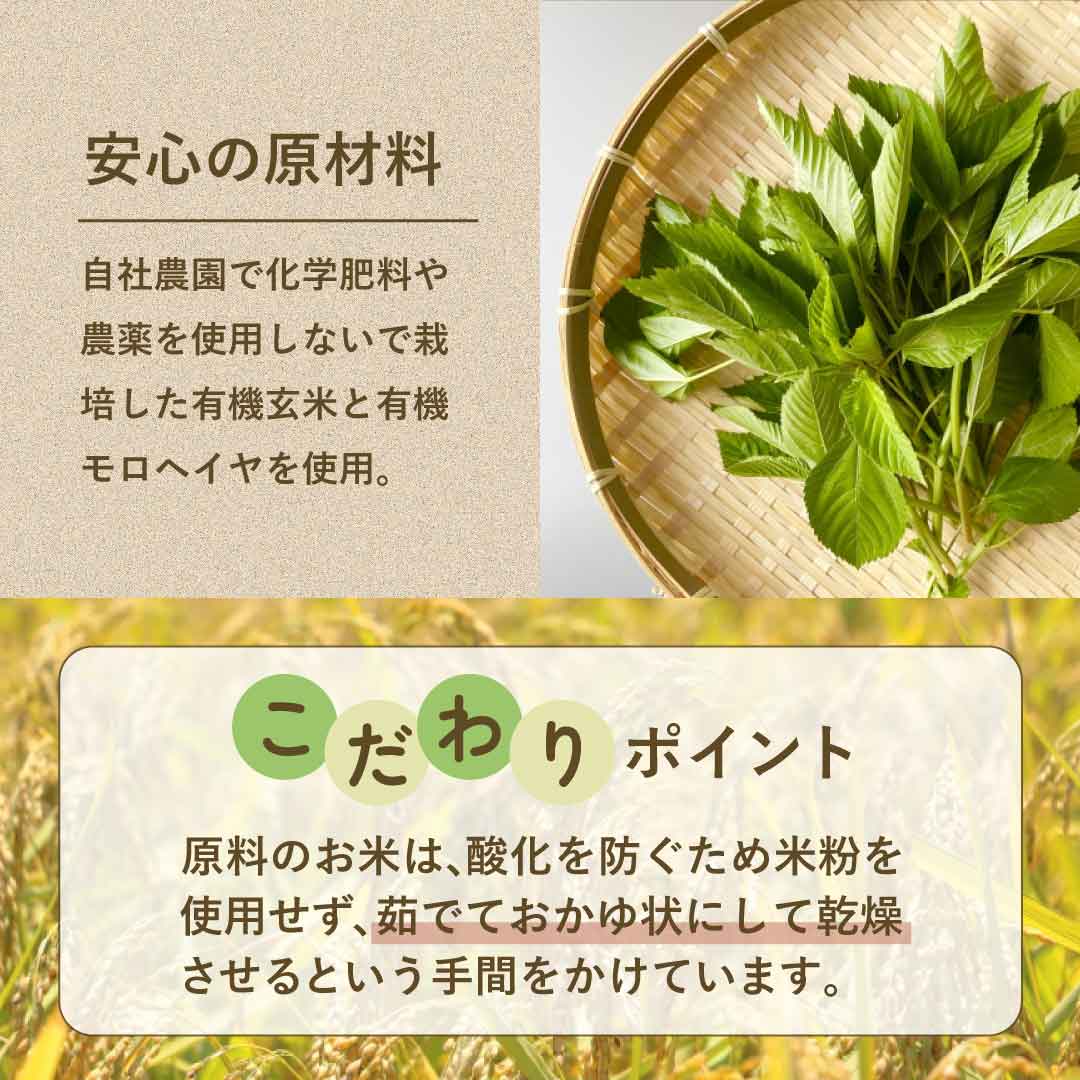 化学肥料や農薬を使用しないで栽培された玄米とモロヘイヤパウダーを使用しています。