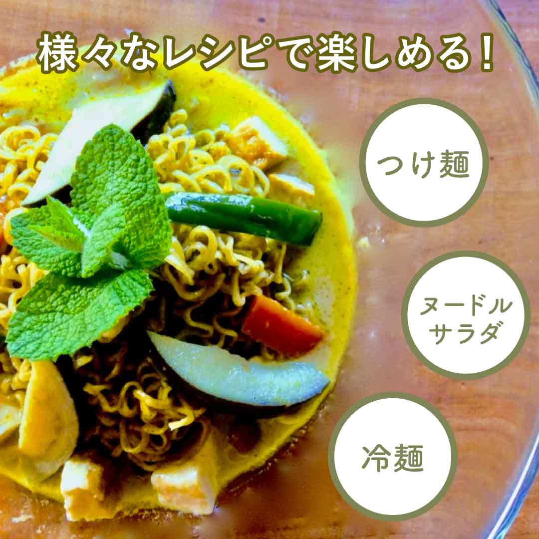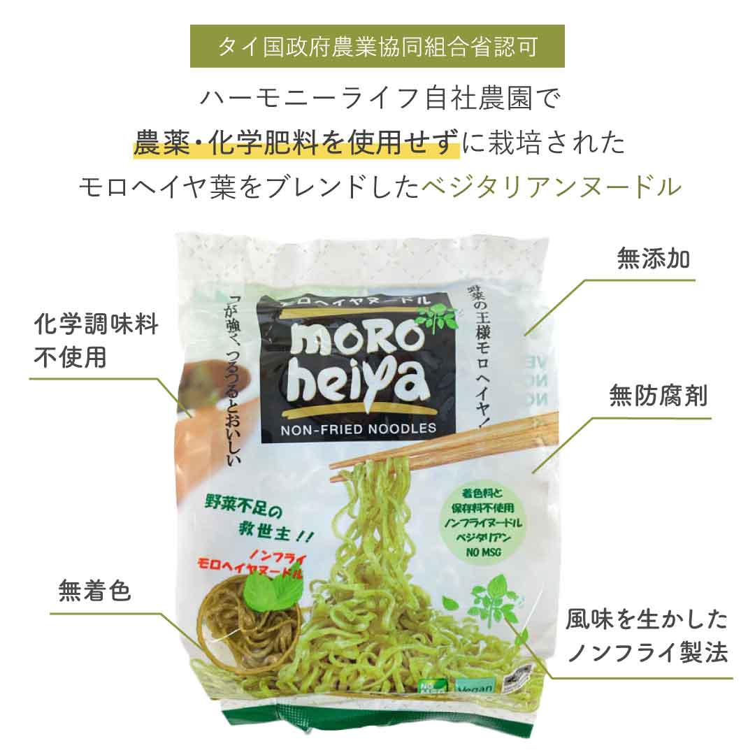 本製品は、タイ国政府農業協同組合省認可のハーモニーライフ自社農園で農薬・化学肥料を使用せずに栽培されたモロヘイヤ葉をブレンドしたベジタリアンヌードル。ノンフライ製法で風味を生かしています。着色料、保存料不使用。
