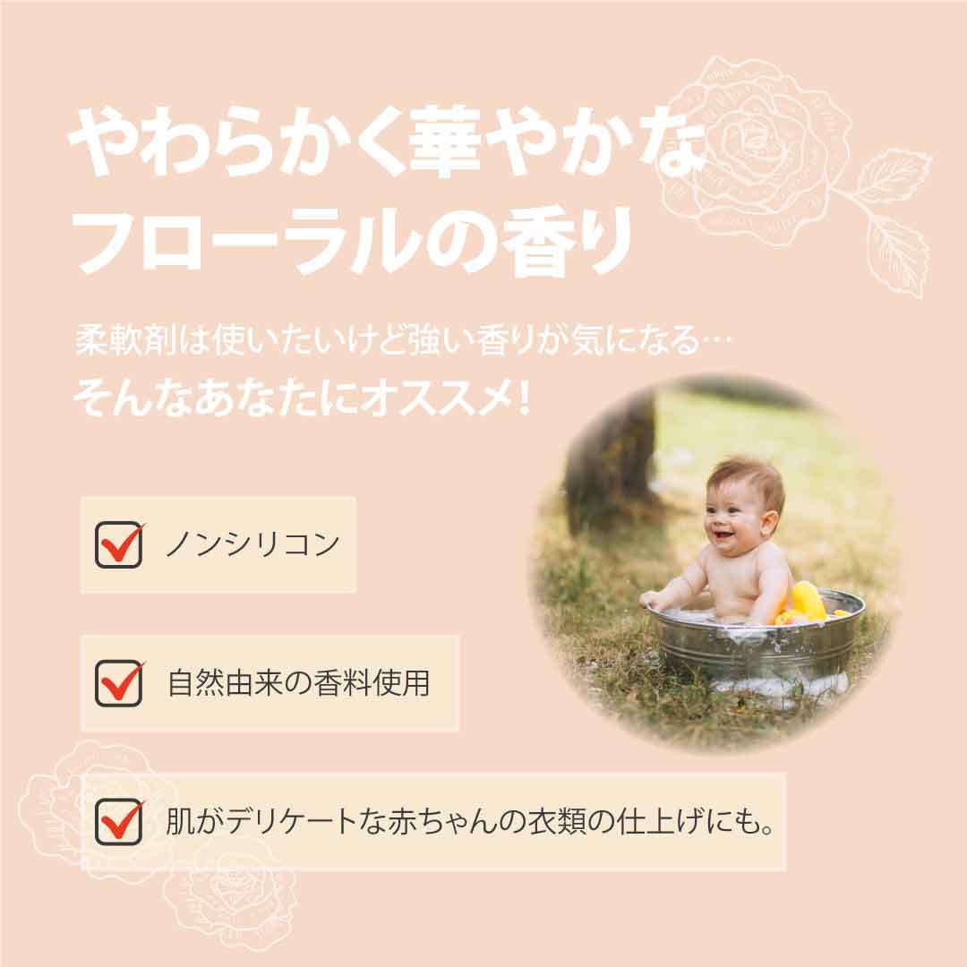 自然由来の香料を使用した、やわらかく華やかなフローラルの香りの柔軟剤。