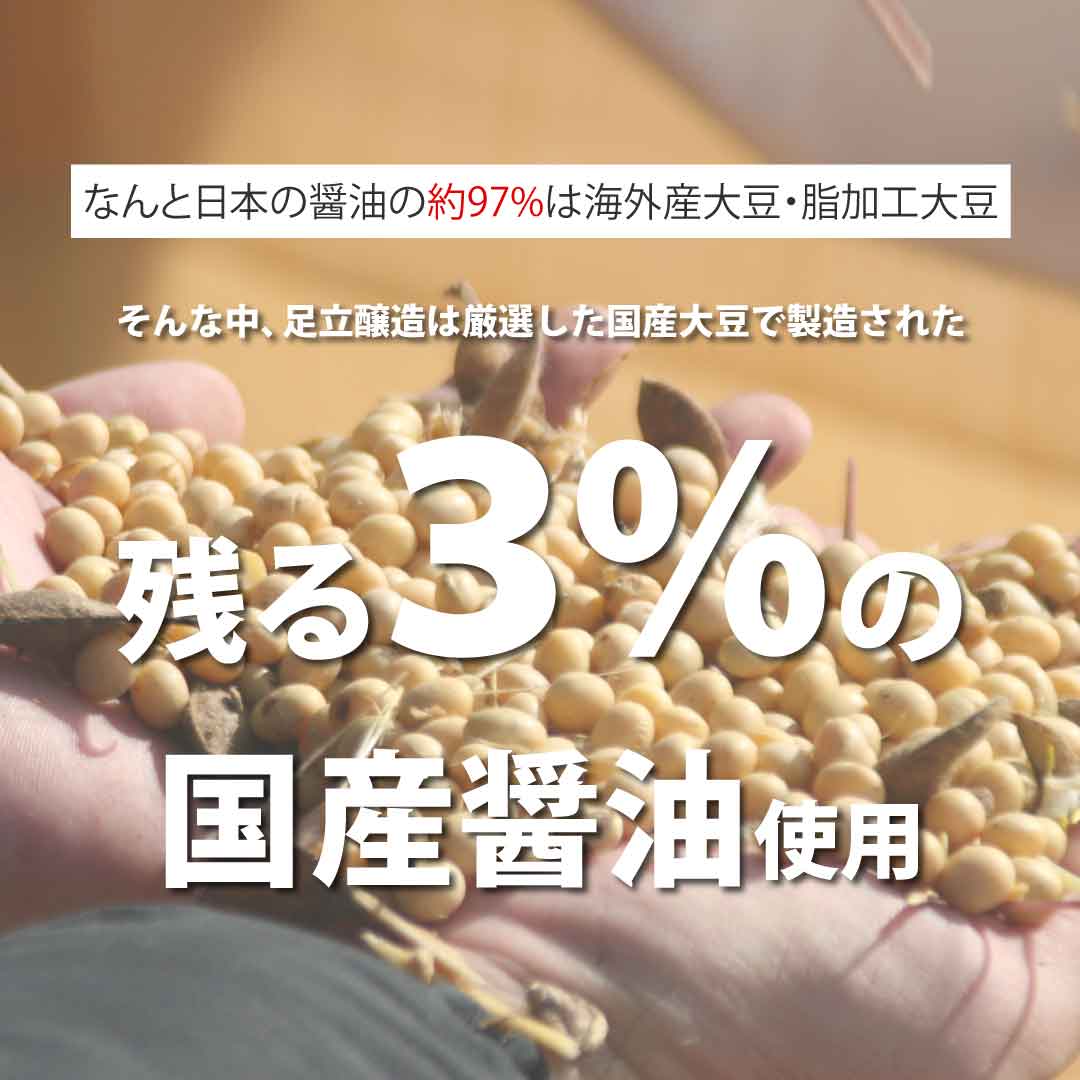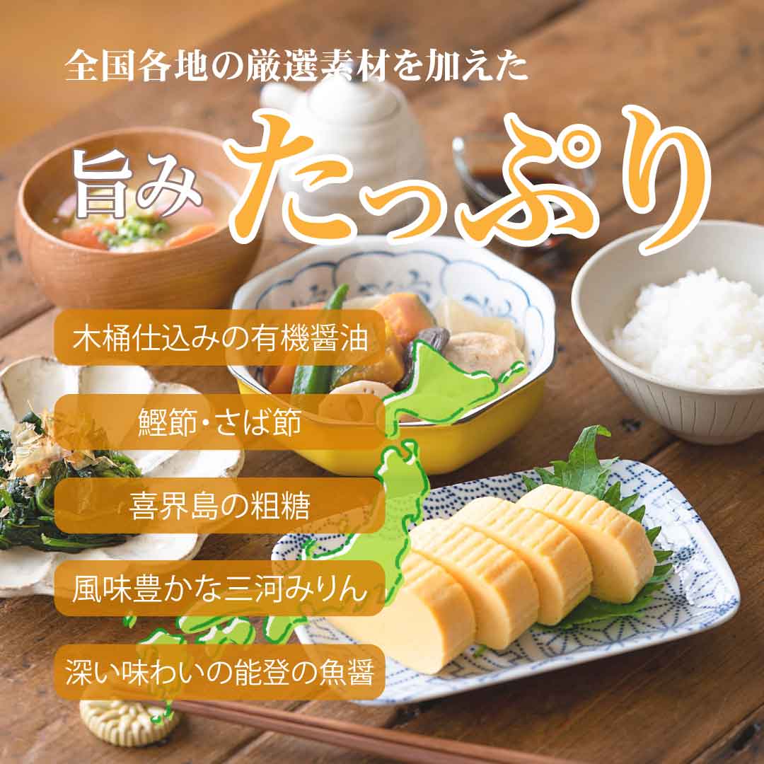足立醸造の「だししょうゆ」は国産有機醤油に鰹節やさば節、喜界島の粗糖、三河みりん、能登の魚醤など厳選した素材を加えてつくっており、化学調味料・食品添加物は一切使用していません。