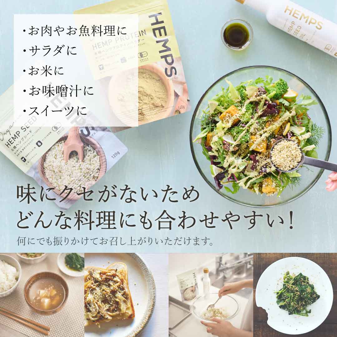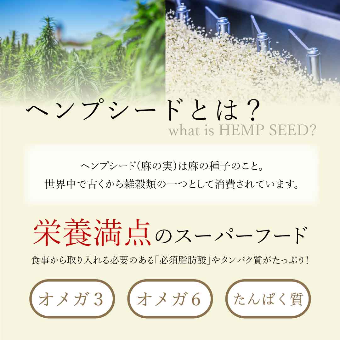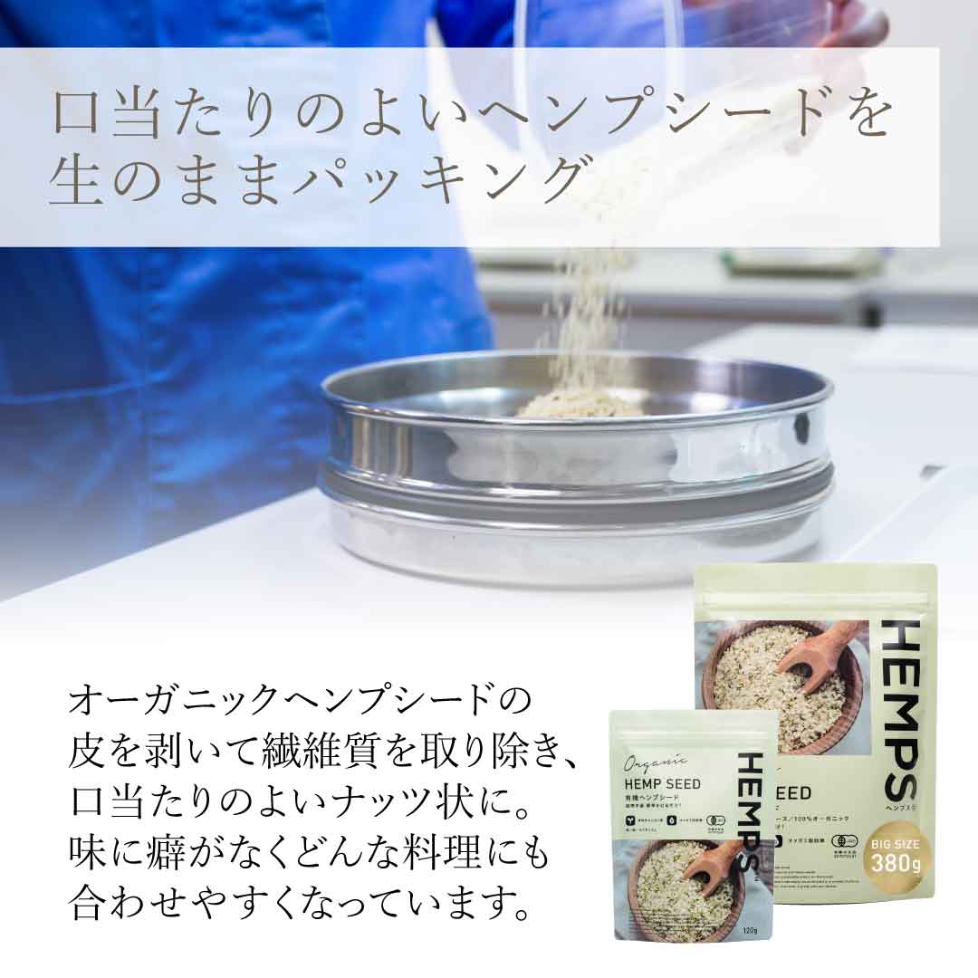 ヘンプシードはヘンプの種子(麻の実)の皮を剥いて取り除き、口当たりのよいナッツ状にしたものです。