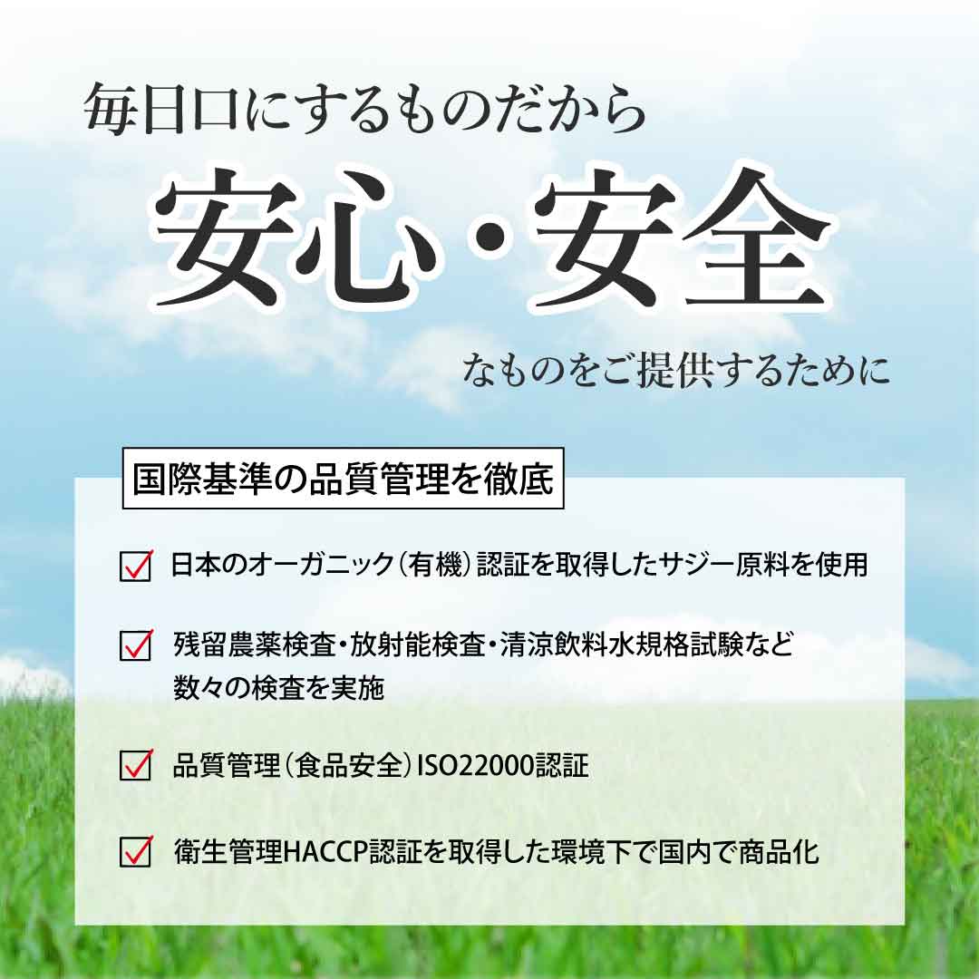 サジーワンは、日本のオーガニック(有機)認証を取得したサジー原料を使用し、さらに、残留農薬検査・放射能検査・清涼飲料水規格試験など数々の検査を実施。また品質管理(食品安全)ISO22000認証、衛生管理HACCP認証を取得した環境下で国内で商品化しております。