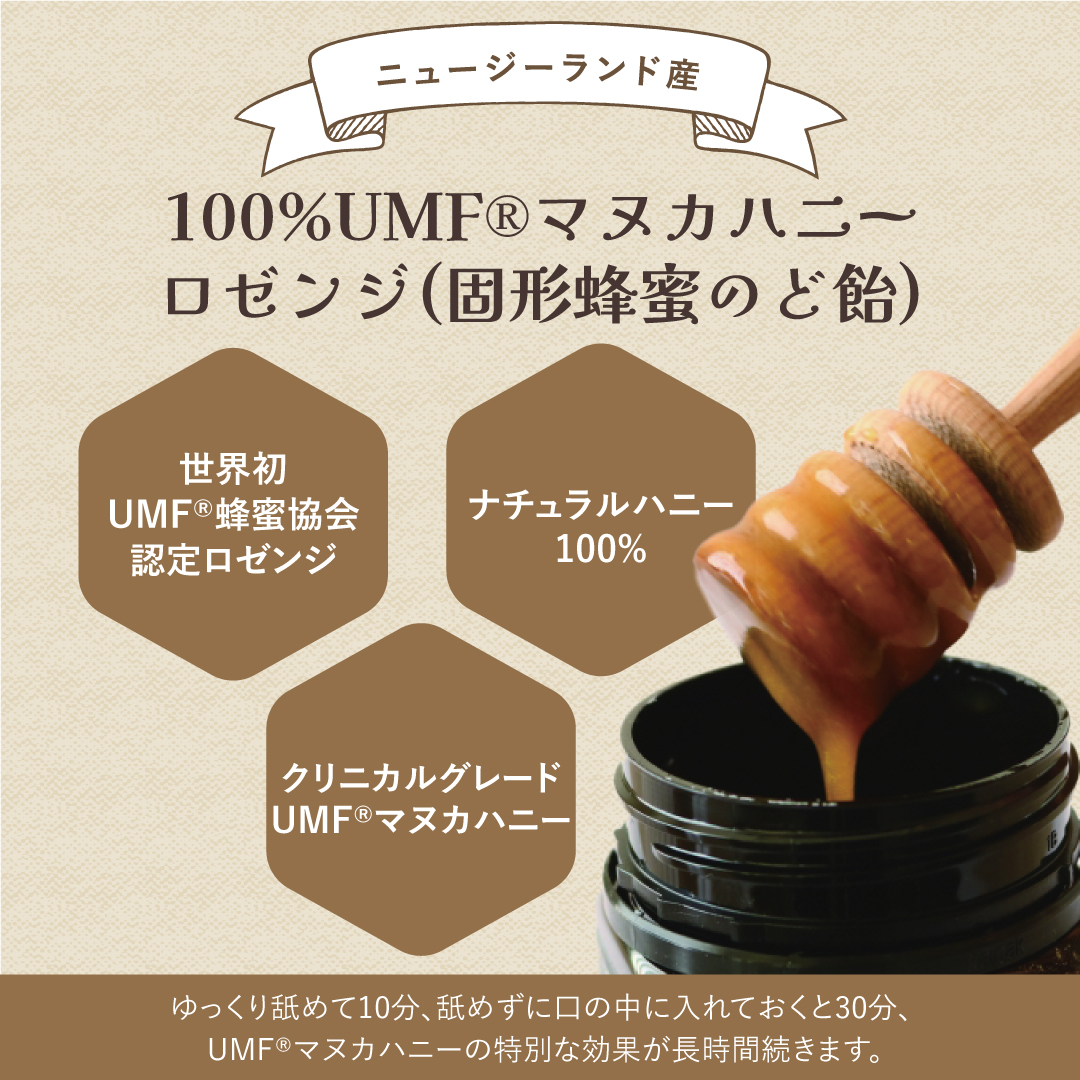 ・ニュージーランド産、100%UMF®マヌカハニーロゼンジ(固形蜂蜜のど飴)