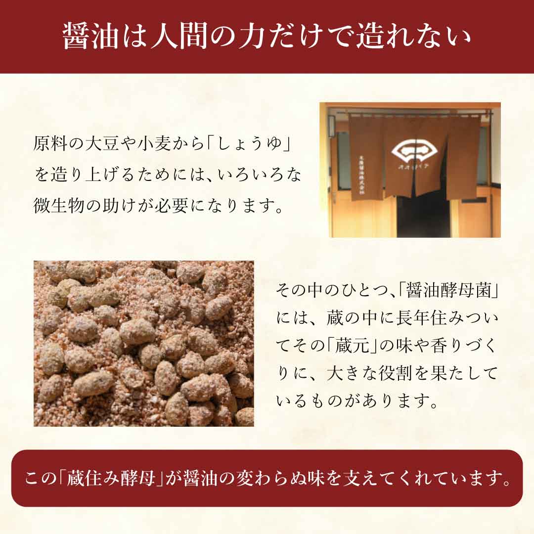 醤油は人間の力だけで造れるものではありません。原料の大豆や小麦から「しょうゆ」を造り上げるためには、いろいろな微生物の助けが必要になります。その中のひとつ、「醤油酵母菌」の中には、蔵の中に長年住みついてその「蔵元」の味や香りづくりに、大きな役割を果たしているものがあります。