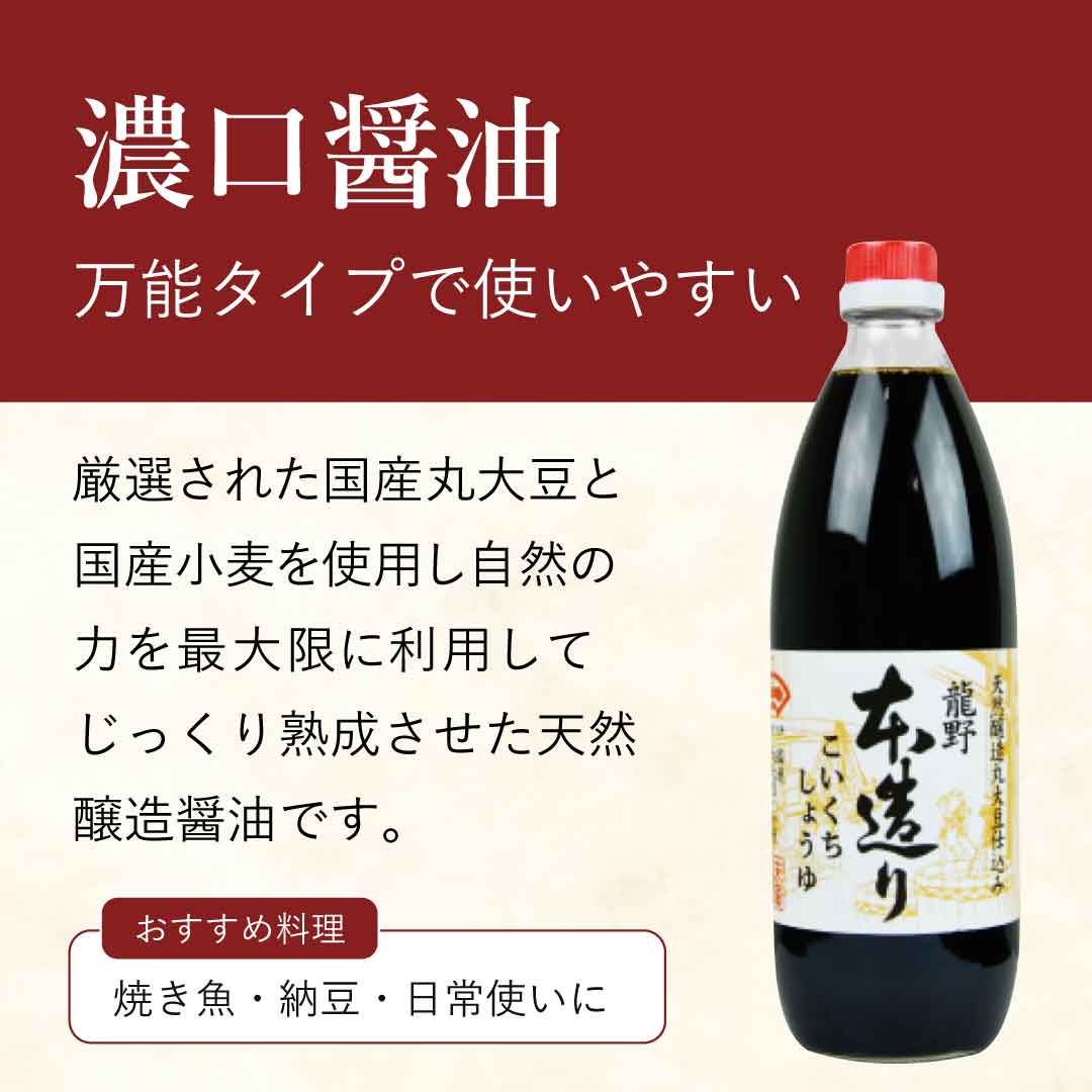 厳選された国産丸大豆と国産小麦を使用し自然の力を最大限に利用してじっくり熟成させた天然醸造醤油です。本品は400年来の醤油の銘醸地で知られる龍野でその伝統の上に豊富な経験と新しい技術により精選した丸大豆・小麦を使って真心をこめて熟成・醸造した本物の醤油です。