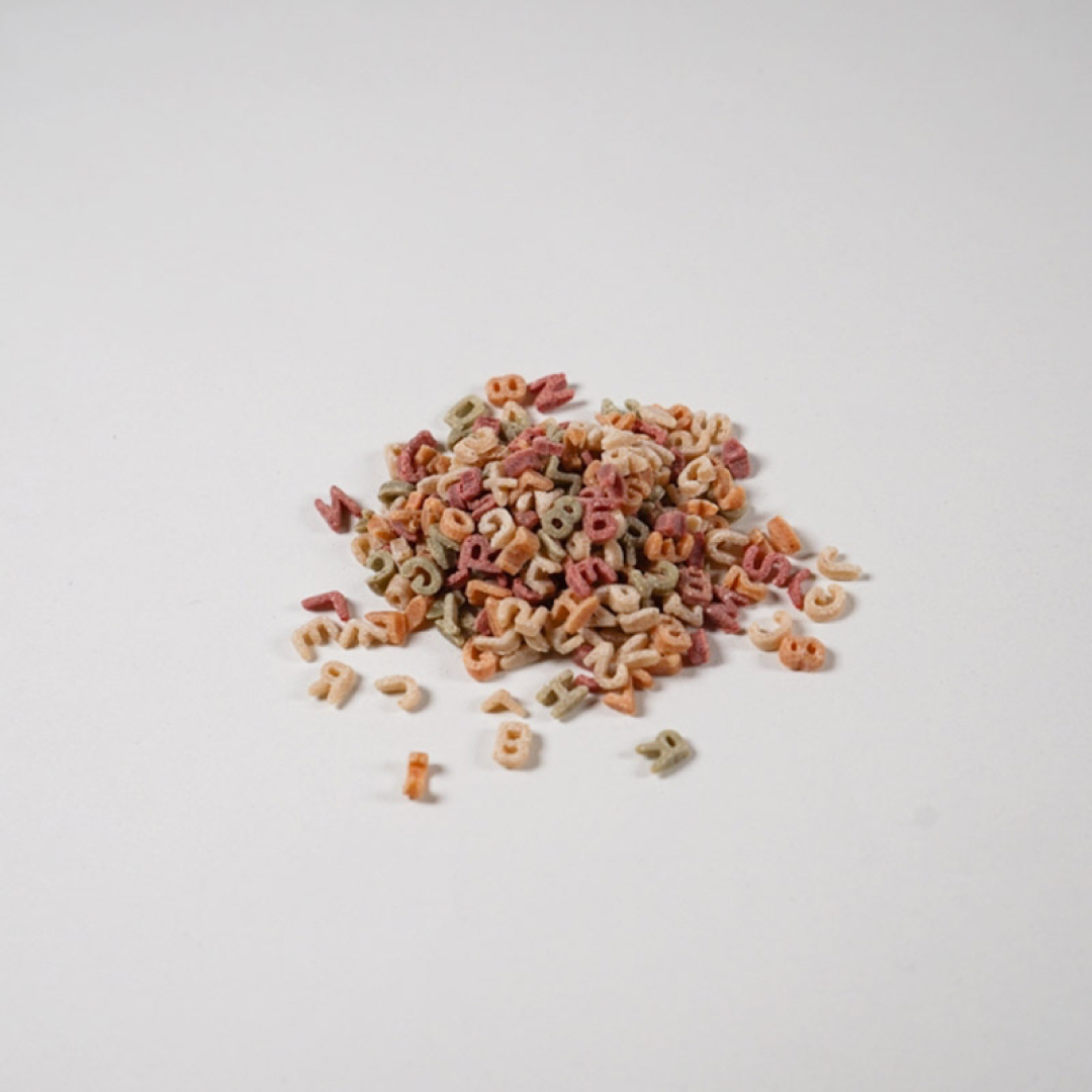 カラフルな色合いのアルファベットの形をしたパスタです。ビーツ粉、ほうれん草粉、人参粉、ベニの木の種皮等、自然なもので色づけしています。スープの具として、サラダに混ぜてと、子ども達に大人気。