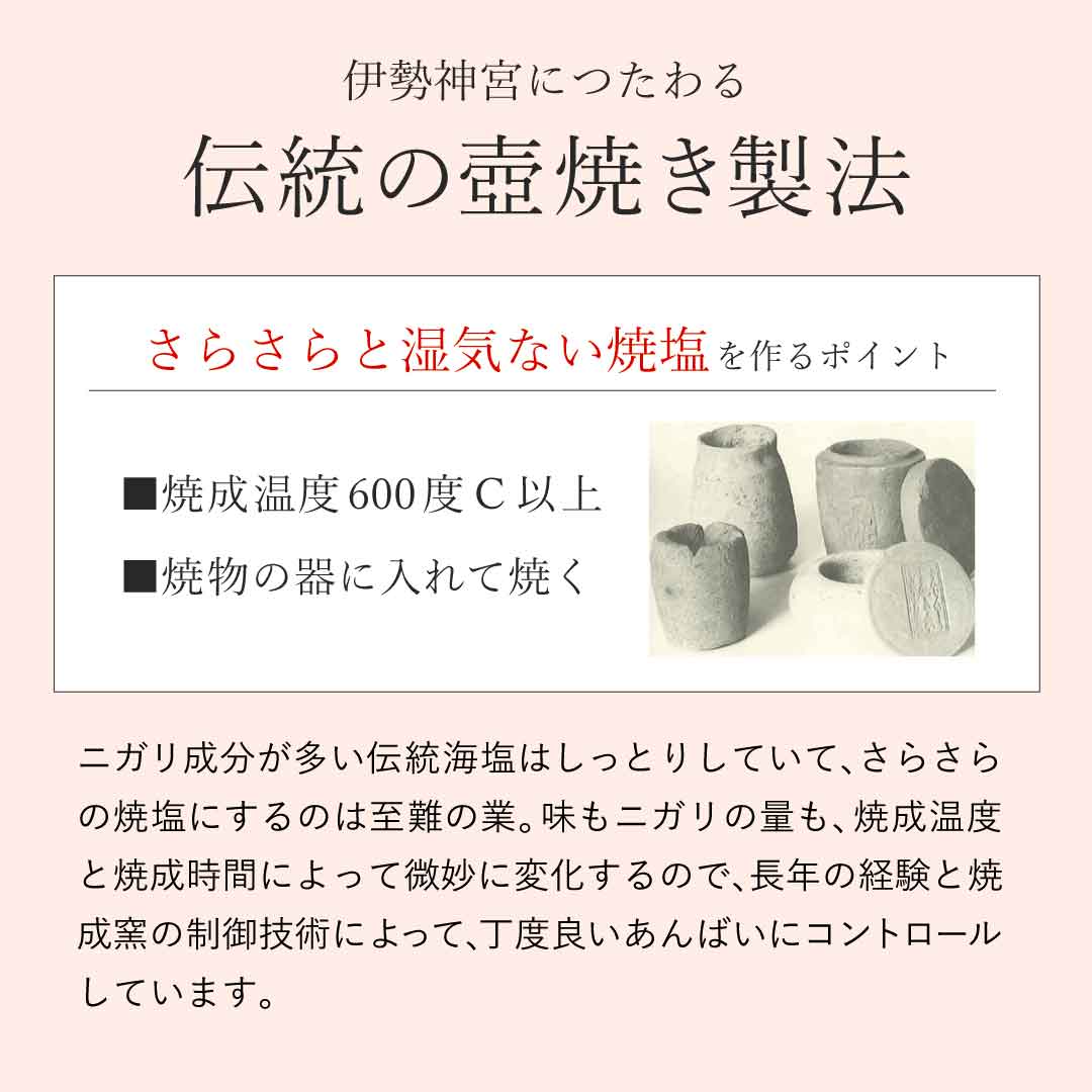土鍋で炒ったくらいで、ニガリ成分の多い伝統海塩(あらしお)を、湿気にくい焼塩にするのは、とても困難です。伊勢神宮・御塩殿(みしおどの)神社に伝わる古式壺焼製法を参考に、おいしいけどさらさらの伝統焼塩を完成しました。