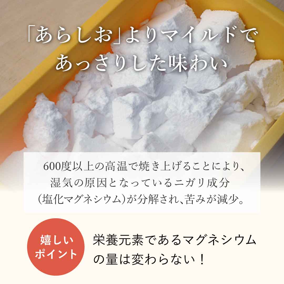 600度C以上の高温で焼き上げていますので、湿気の原因となっているニガリ成分(塩化マグネシウム)が分解しています。そのため苦味が減り、「あらしお」よりマイルドであっさりした味わいになっています。けれども、栄養元素であるマグネシウムの量は変わりありません。