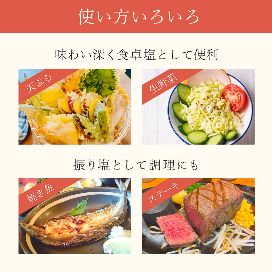 食卓塩として、生野菜、ゆで卵、目玉焼き、天ぷら、刺身などに便利なだけでなく、味わい深いお塩です。炒めもの、焼魚、ステーキなど、特に振り塩として、調理にもご活用いただけます。