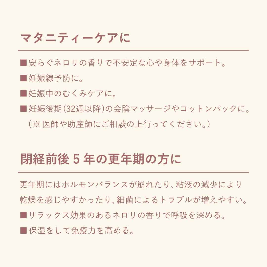 マタニティー期間中の不安定な心や身体を、安らぐようなネロリの香りで、新しい生命のため、そしてママ自身を愛しむようにサポートします。