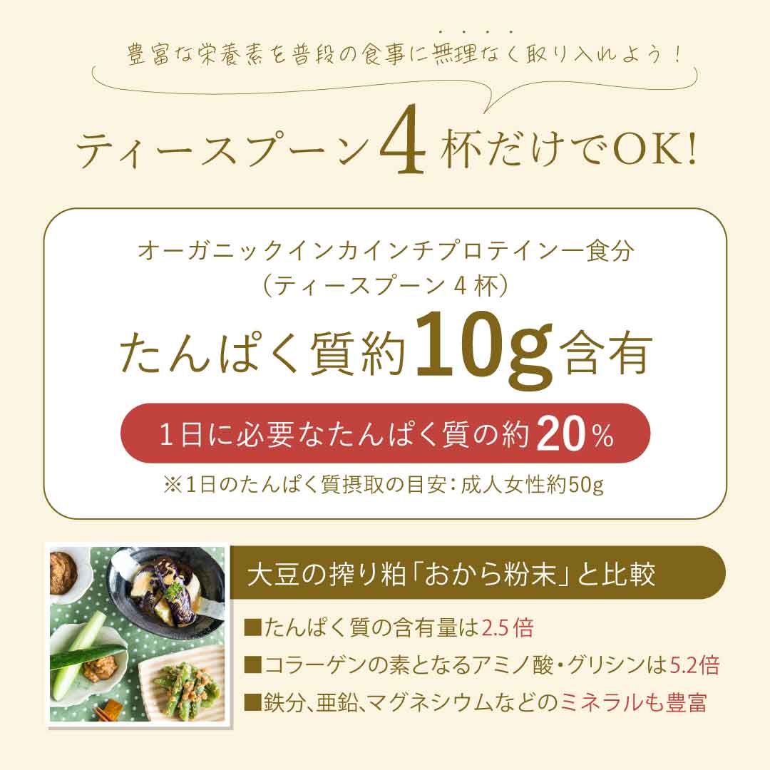 ペルーアマゾン産有機インカインチナッツを低温圧搾で搾油・脱脂・アルファ化した「おから(ナッツの搾り粕)パウダー」。きな粉のような風味で優しい甘味があり、無理なく続けられる美味しさが特長です。