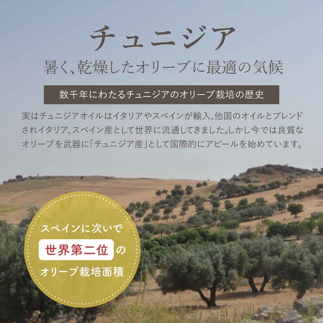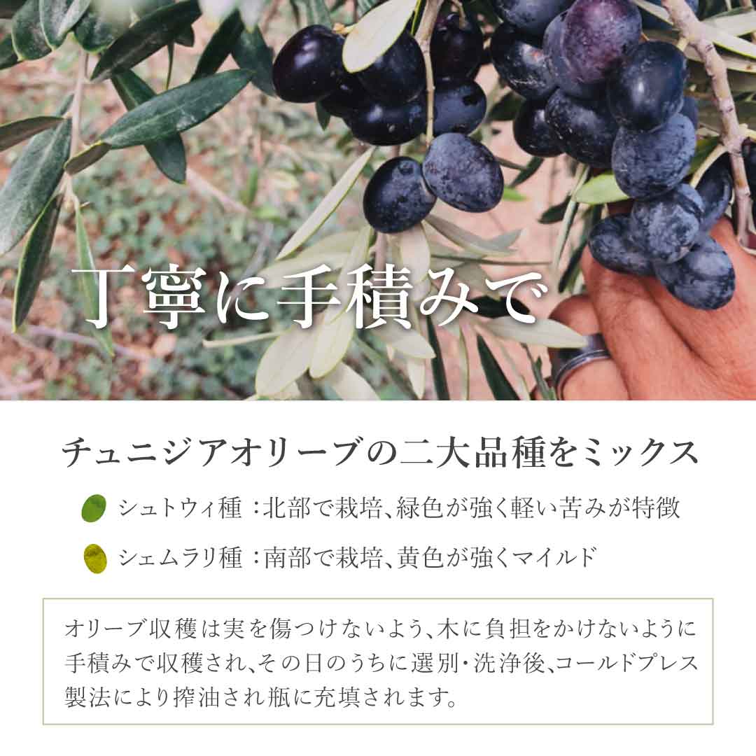 チュニジアオリーブの二大品種をコールドプレスで搾油し、ミックスしています。