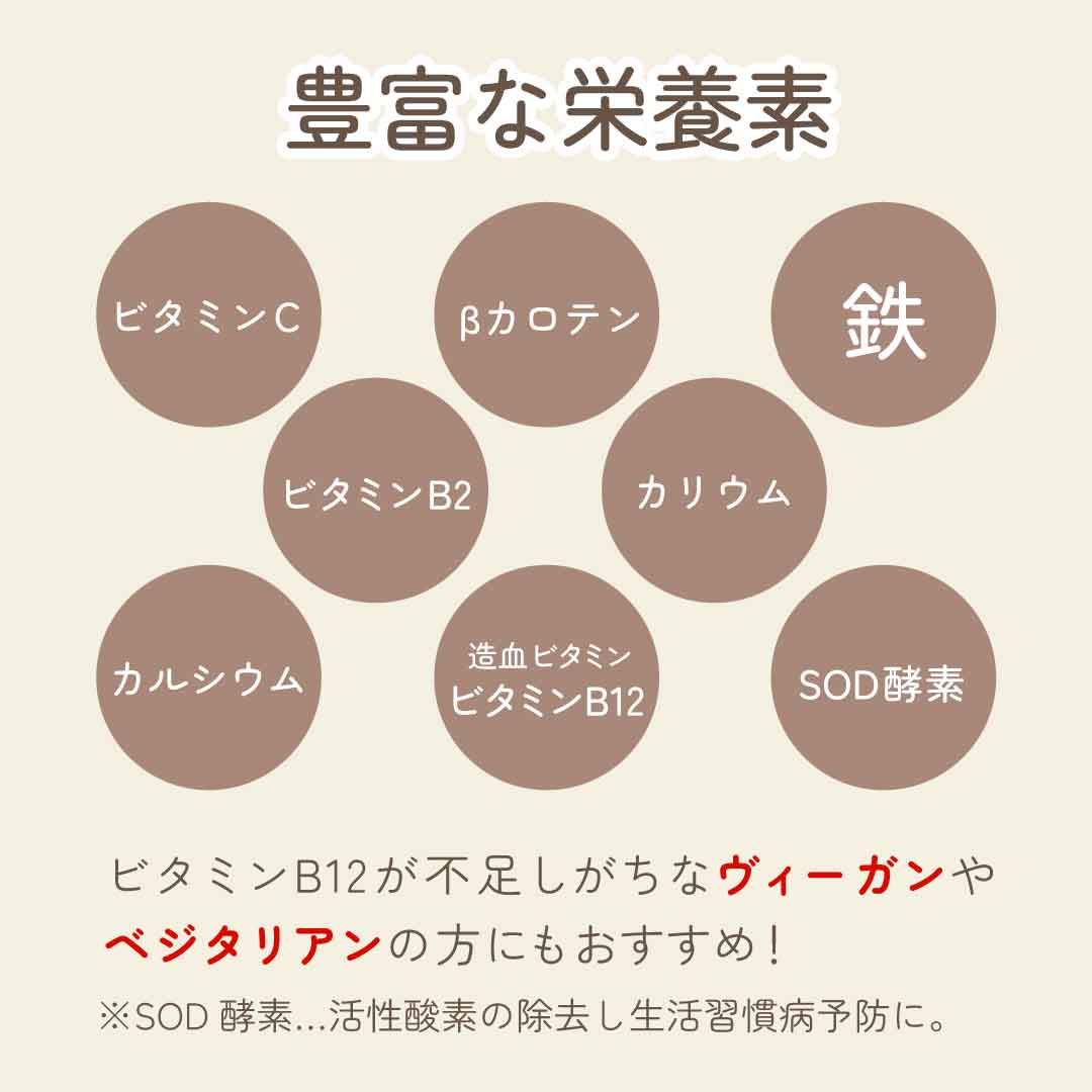明日葉は野菜の中でもビタミン、ミネラル、食物繊維が豊富です。また動物性食品(お肉・魚)の摂取により十分補うことの出来るビタミンB12はベジタリアンの方やヴィーガンの方は不足しやすく、貧血等(鉄分不足)も気になります。