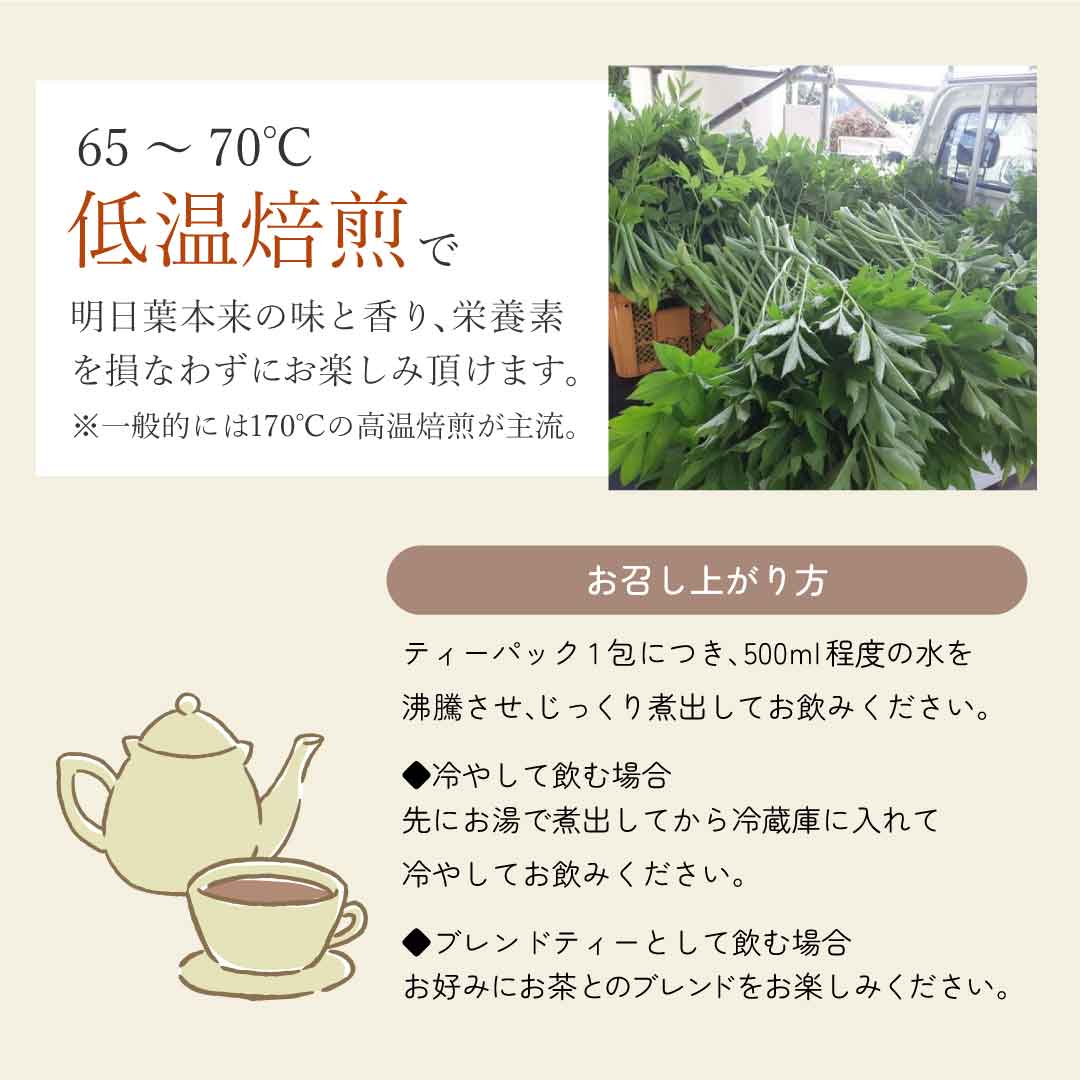 造血ビタミンB12を多く明日葉茶を日々の健康茶として取り入れてみてはいかがでしょうか?